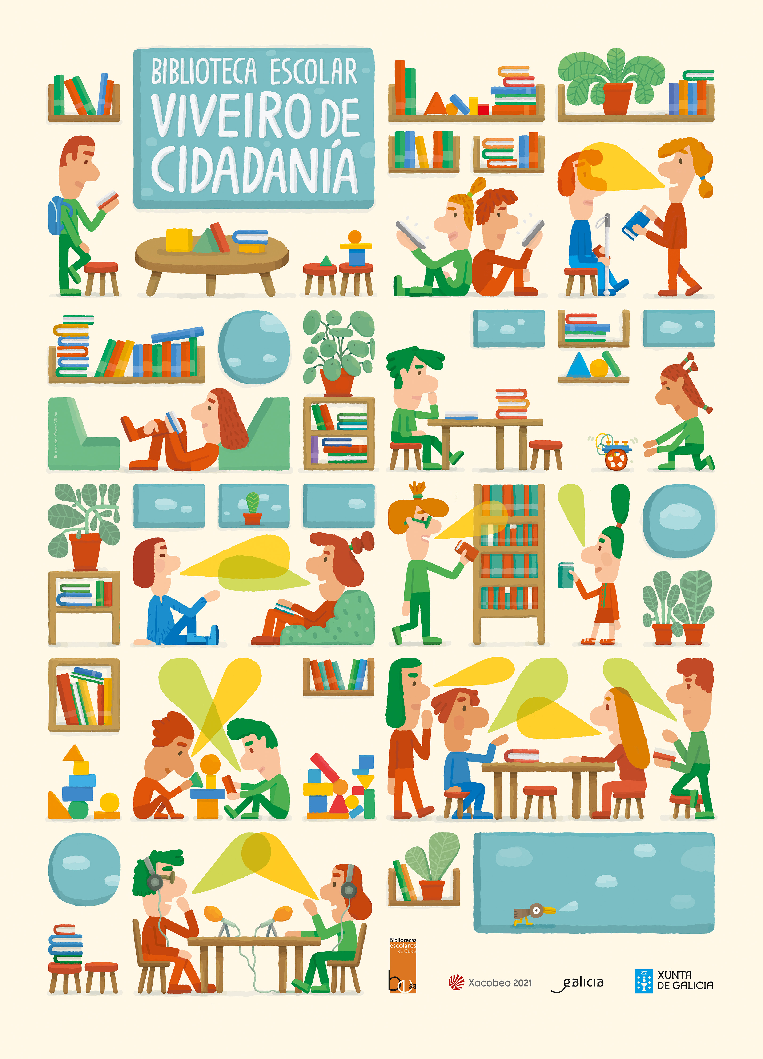A Dirección Xeral de Centros e Recursos Humanos, seguindo a súa dinámica de difusión das posibilidades que ofrece a biblioteca escolar ao conxunto da comunidade educativa, dá a coñecer o lema que propón ás bibliotecas escolares galegas para o presente curso 2019/2020: "Biblioteca escolar, viveiro de cidadanía". Nesta ocasión é o ilustrador Óscar Villán quen interpreta o lema e nos ofrece unha imaxe múltiple e evocadora de diversas situacións que unha biblioteca escolar pode facilitar.