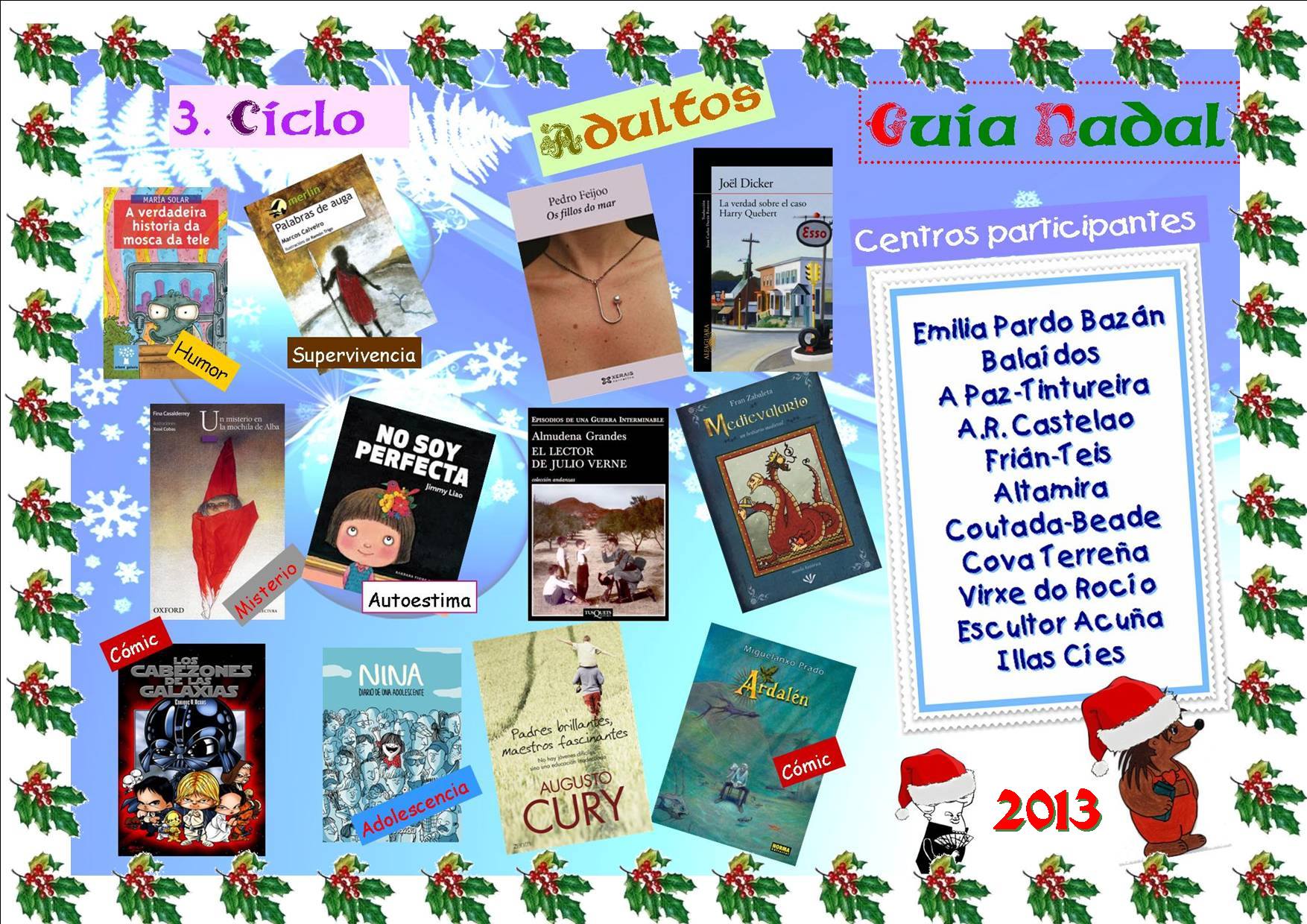 Comezan a chegar as primeiras guías de lectura para o Nadal desde as bibliotecas escolares galegas. Estas guías, moi diversas en enfoque e contido, están pensadas para orientar a selección de lecturas do alumnado e das súas familias e para axudar a nais e pais na escolla de agasallos de calidade. Reflicten a variedade de oferta que a indstria editorial galega e foránea pon a disposición das persoas lectoras. Son, pois, un instrumento para o fomento da lectura especialmente cando inclúen unha pequena recensión que orienta sobre o contido de cada un dos títulos seleccionados. Ademais de libros, as guías acostuman recomendar música ou cine, e tamén recollen con frecuencia, enderezos electrónicos de interese.