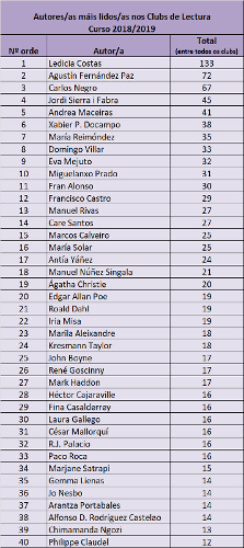 Coma en anos anteriores, trala revisión das memorias dos Clubs de lectura correspondente ao curso 2018/2019, e á vista das lecturas realizadas polos diferentes grupos integrados no club de lectura de cada centro participante, pódese coñecer a relación dos 50 títulos máis lidos así como o número de lectura realizadas